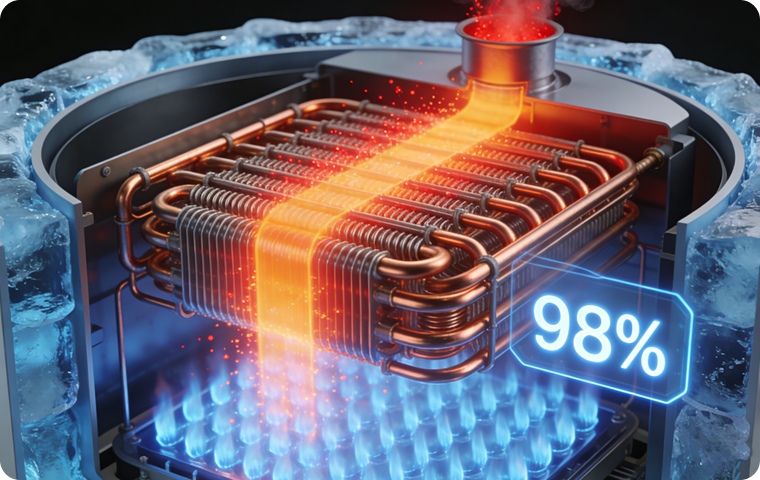 Recovers latent heat from exhaust gases through water vapor condensation, improving overall thermal efficiency and reducing fuel consumption.